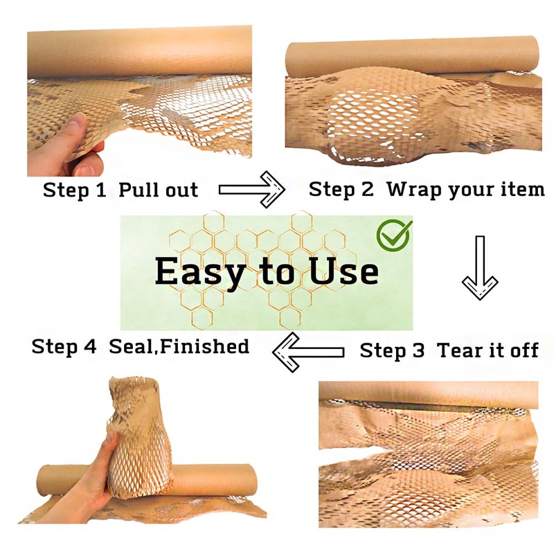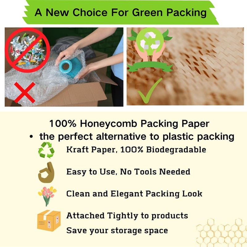 - Great green alternative to bubble wrap: It is the Green Packing Paper for Moving or Shipping Breakables and Delicate Items. Our honeycomb packaging paper is an innovative and effective cushioning kraft paper. So compared to the plastic bubble cushion wrap, this honeycomb paper roll is degradable, recyclable and reusable. It is Environmental Friendly Packing Supplies.