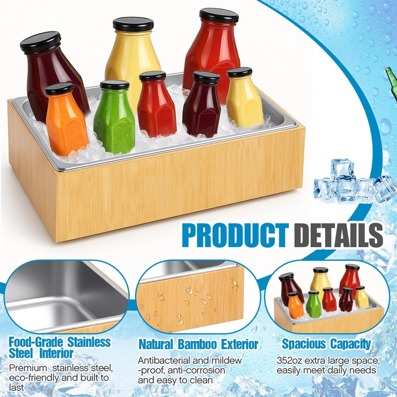 - Open-Access Design: featuring an open-top configuration, the tray facilitates easy filling with ice cubes and efficient chilling plus display of beverages; This design allows guests clear visibility and straightforward access to drinks, contributing to smoother service flow in social or commercial settings by minimizing potential bottlenecks