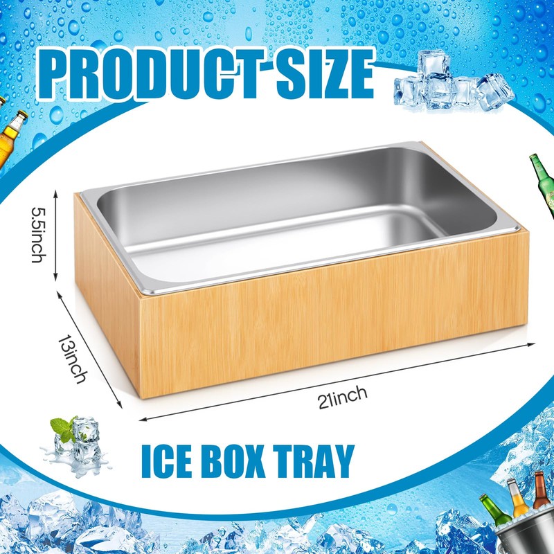 Honeydak 21" x 13" x 5.5" Inches Ice Housing Steel Ice Holder Bin with Removable Bamboo Tray Container for Display Buffets, Bar Counter, Party Drink Chiller