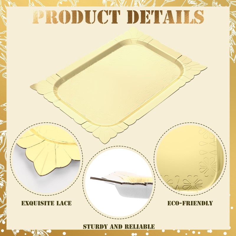 - Suitable Size for Versatile Use: Measuring 9.84 x 13.78 inches (25 x 35 cm), these gold paper trays provide ample space for various culinary presentations. It can hold a variety of desserts, such as cupcakes, appetizers, and cake platters, etc. Note that these trays are not suitable for holding heavy food, nor are they suitable for serving plates. Instead, they are applied to display your delicious dishes at parties, adding an unignorable charm to your food