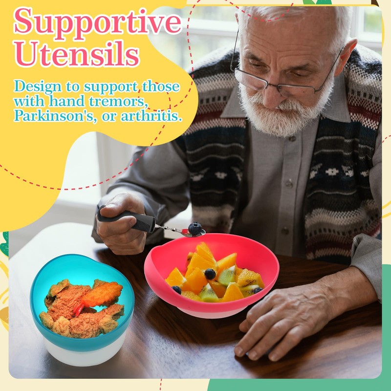 - Innovative Design: the adaptive dinnerware's high to low design helps hold food, providing more control when you eat; The suction cup on the base fixes the bowl and plate on the table, making you more at ease; The bendable cutlery set is flexible, and the angle can be adjusted according to your personal preferences; The large and heavy handle provides stability and control during eating