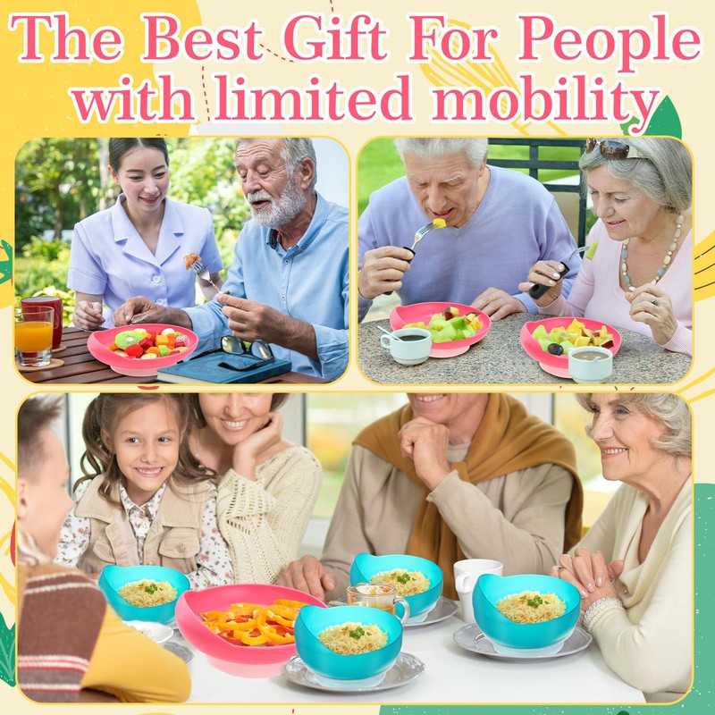 - Product Details: the bowl and plate feature wide rim contoured lip, deep sides, anti skid rubber suction bottom; Because it allows you to easily eat with one hand without spilling food, it is suitable for elderly, arthritis, weak hand grip and disabled, Parkinsons, ideal for nursing homes, health centers, hospitals
