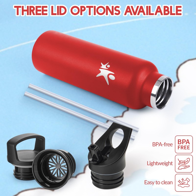 - 2 interchangeable leak-proof bottle lids: (1) The flip straw sports cap effortlessly delivers a high flow that allows you to drink stainless steel from your drinking bottle without removing the cap. (2) Handle lid: This clasp comes with a carrying ring and a filter. It can block the tea leaves, fruits and ice cubes or something else when drinking.