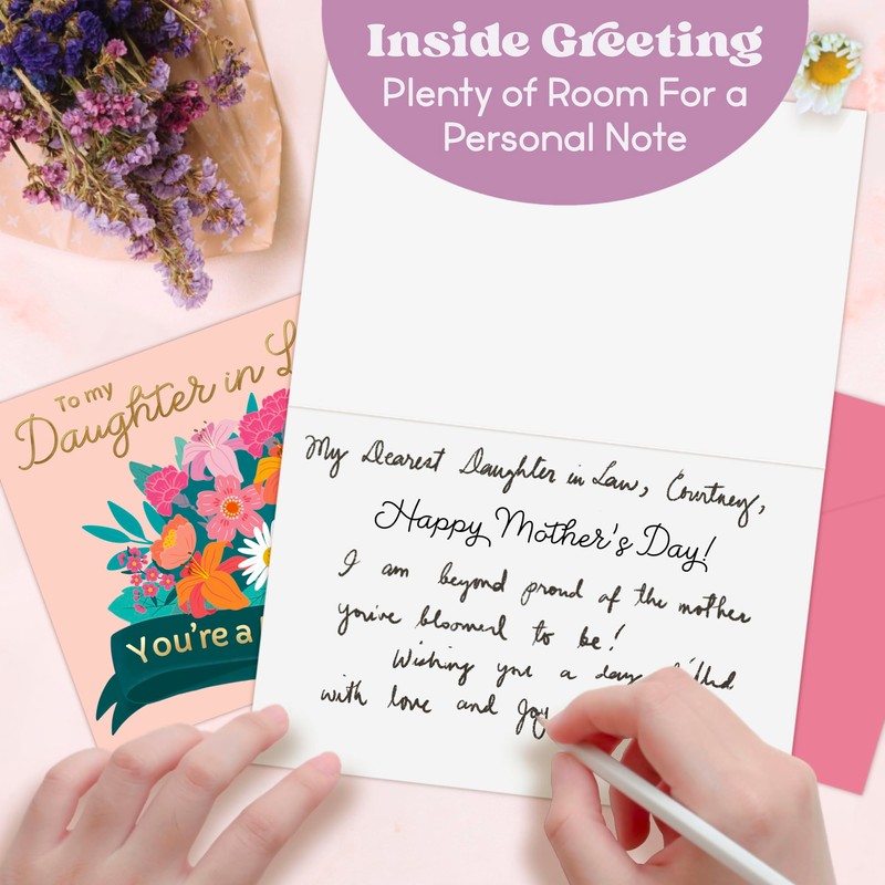 - Plenty of Space for a Personal Touch – The card’s interior features a stylishly designed "Happy Mother's Day" greeting with ample room to write a heartfelt, handwritten message that will make your daughter in law feel truly cherished.