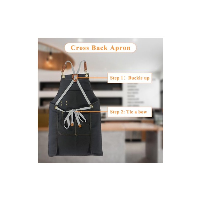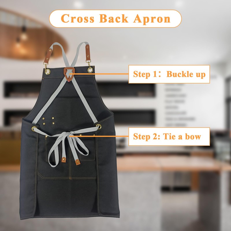 - Adjustable Size: Professional chef aprons are cross back adjustable, no uncomfortable neck or wait ties, which distributes the additional carriage evenly and takes the stress off of your neck and back. Fit for both men and women. The apron is 26''wide and 28''long, and the two pockets are 13''long and 7.9''high