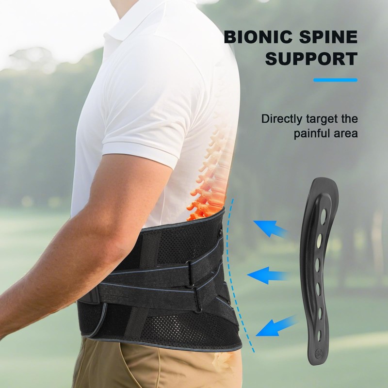 - Advanced Multi-Pain Relief System: Engineered as a multi-functional lumbar support brace, it integrates a bionic bone panel, 4 memory aluminium stays, and 2 flexible springs—offering 4x the support of standard braces. The curved lumbar panel mimics the natural curvature of the spine, ensuring excellent support at home, at work, or while lifting heavy objects, promoting proper posture and preventing injuries.