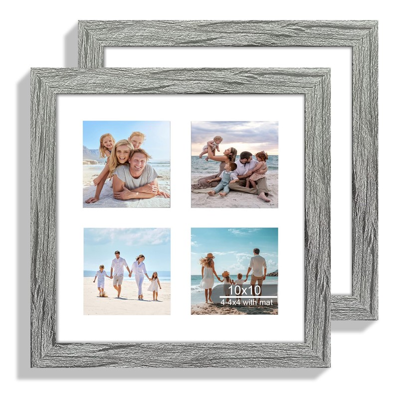 Hongkee 10x10 Picture Frame Set of 2, Real Glass and Grey Collage Frame, Display Pictures Four Opening 4x4 With Mat or 10 x 10 Without Mat for Wall Hanging or Tabletop