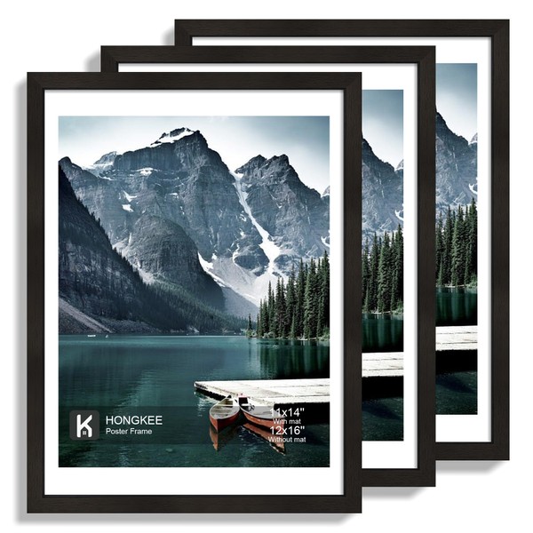 Hongkee 12x16 Picture Frame Set of 3 - Display 11x14 Photo with Mat or 12 x 16 Poster without Mat, Wall Mounting Horizontal and Vertical, Black