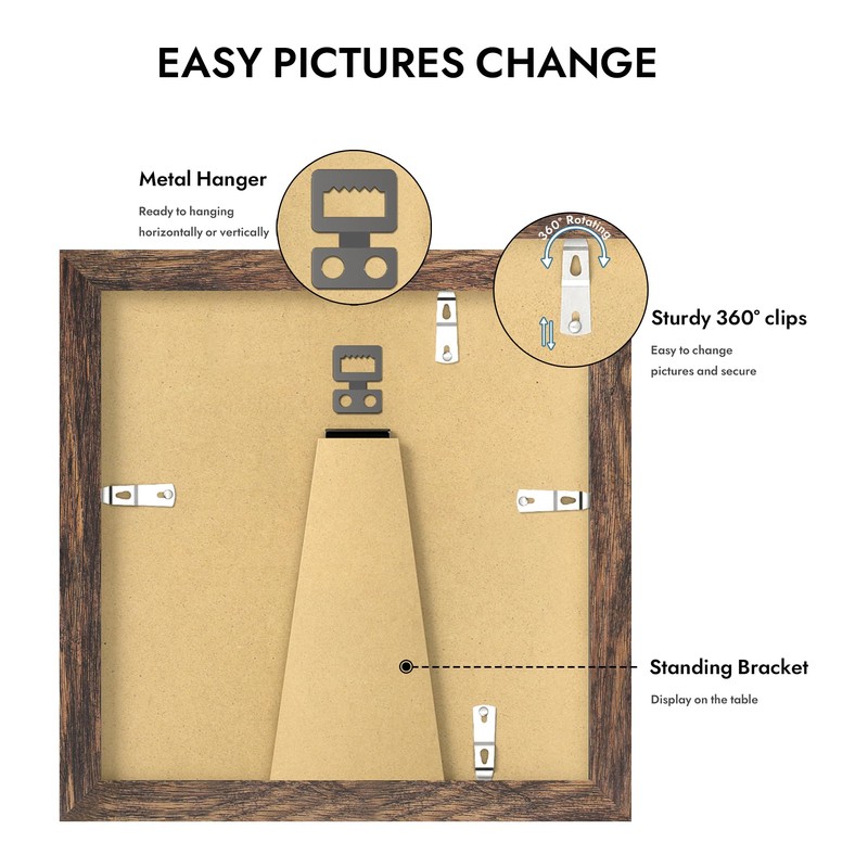 - Easy to Use! The frames 6x6 come with flexible swivel tabs on the back, Spring type action to remove the backing, without hurting fingers. It’s easy to open and put in photos, so you interchange photos regularly with confidence