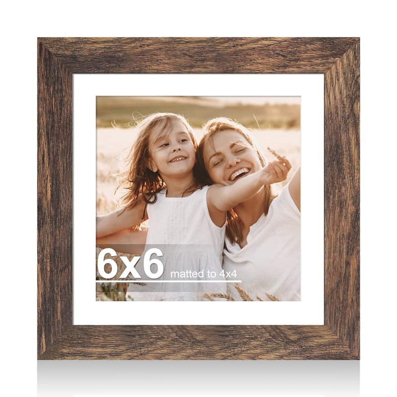Hongkee 6x6 Picture Frame with Glass, Display Pictures 4x4 with Mat or 6 x 6 without Mat - Wall and Tabletop, 6 by 6 Photo Wooden Frames (Rustic Brown, 1 Pack)
