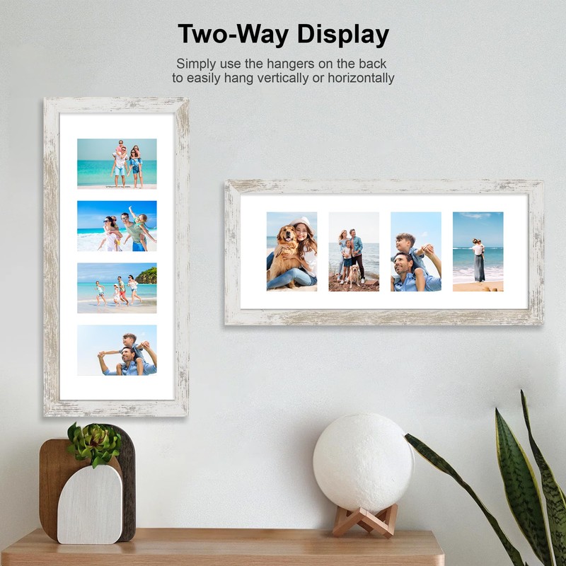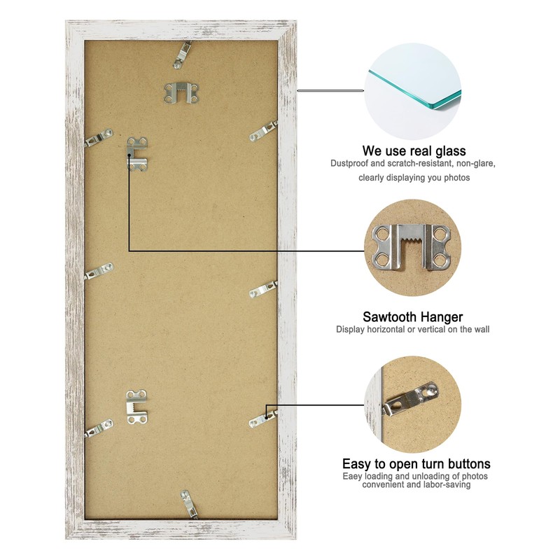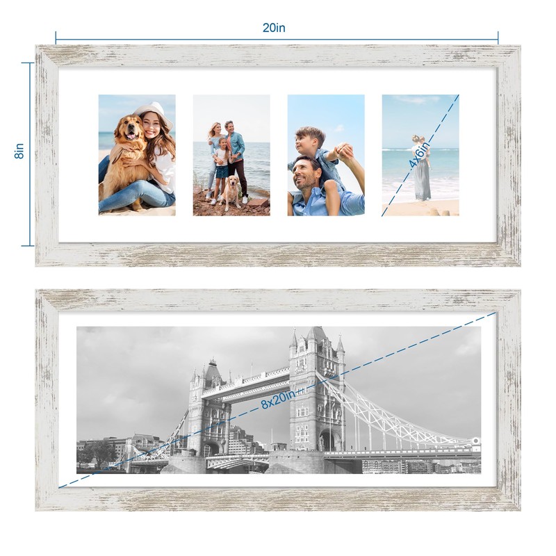 Hongkee 8x20 Picture Frame Set of 2, Distressed White Wood Frame with Tempered Glass Collage Frame, Display Pictures Four 4x6 With Mat or 8 x 20 Without Mat - Horizontal or Vertical Wall Mounting