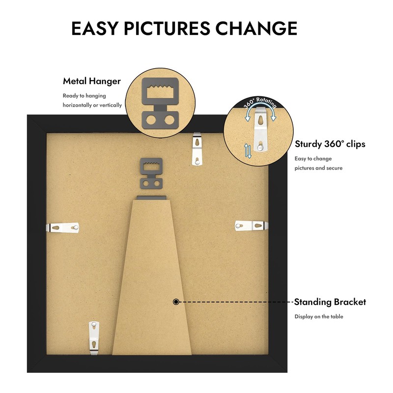 • Easy to Use! The frames 8x8 come with flexible swivel tabs on the back, Spring type action to remove the backing, without hurting fingers. It’s easy to open and put in photos, so you interchange photos regularly with confidence