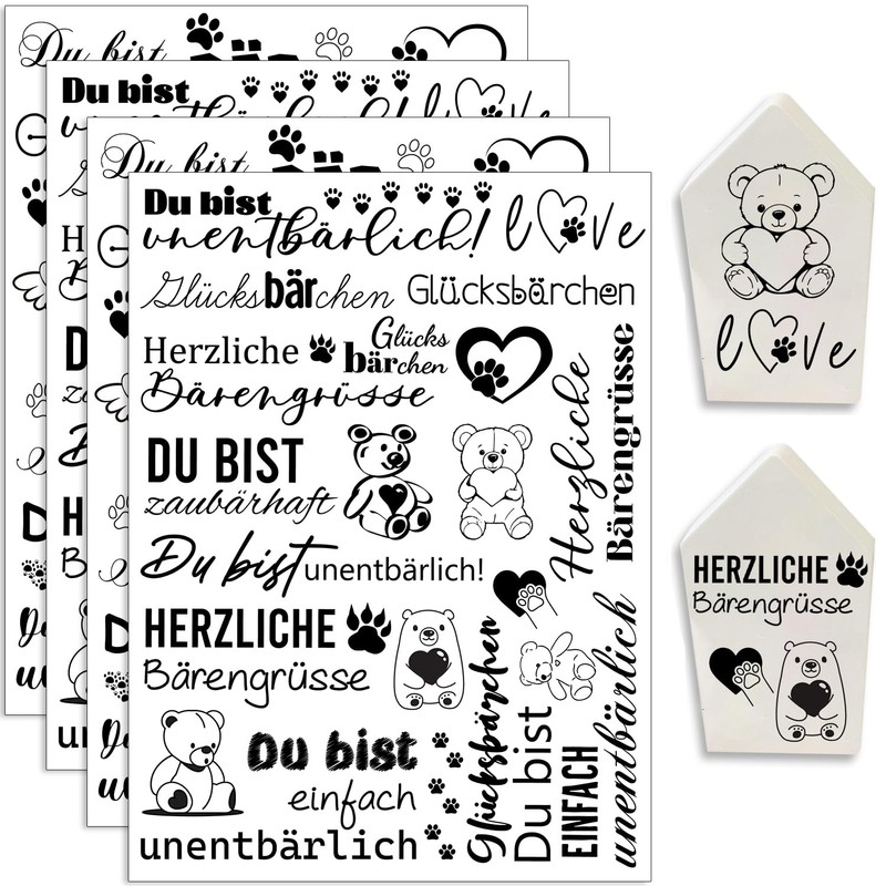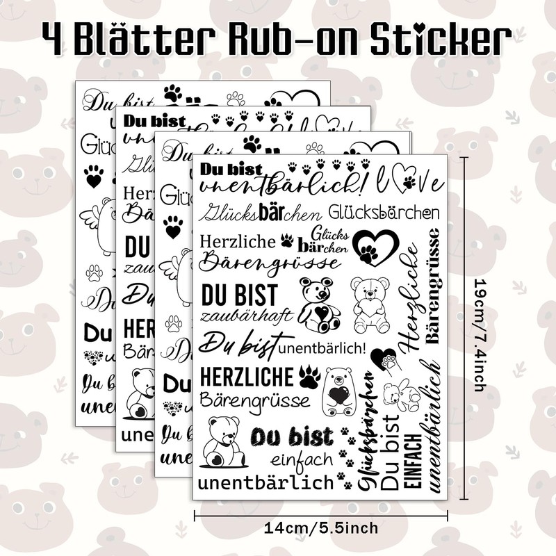 - Rub-on stickers with various sayings: you will receive 4 x sheets of rub-on stickers in the size 14 x 19 cm. The theme of our rub-on foil stickers is ‘Unentbärlich’ (‘indispensable’ with bear motifs). Rub-on stickers can be used for Raysin, Keraflott, blocks and for large quantities as needed.