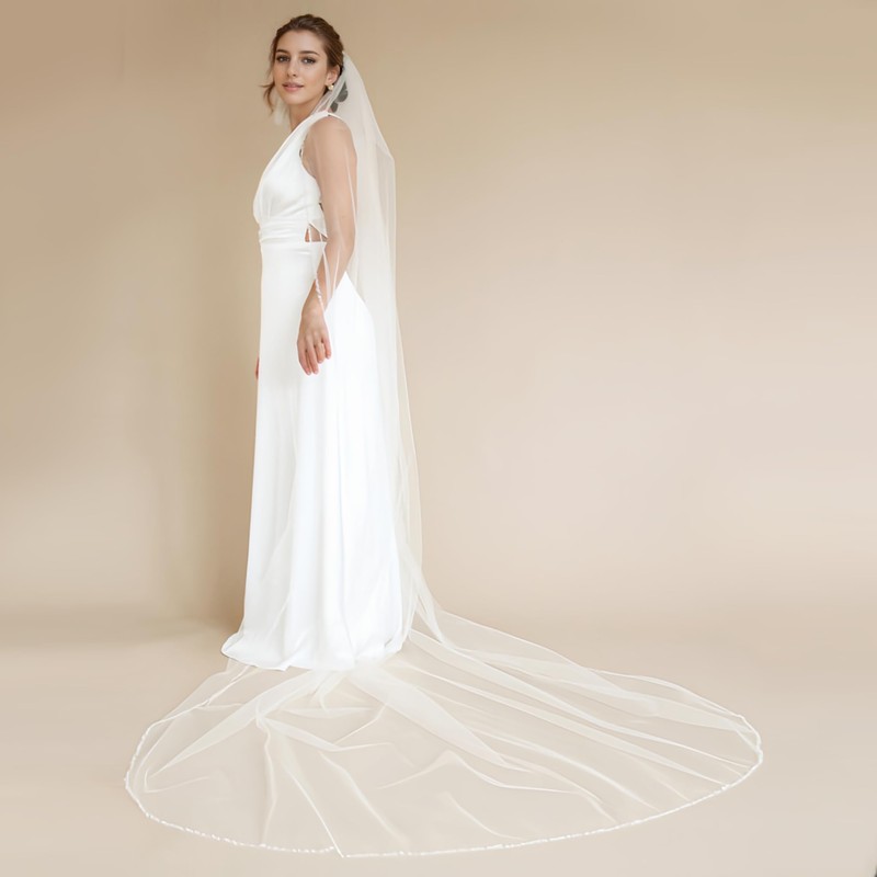 - Cathedral Length: Measuring at the perfect length for easy movement and lovely photos, our veil is versatile and comfortable to wear.
