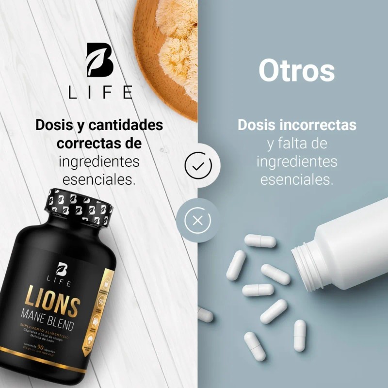 ¡Eleva tu bienestar mental con Lions Mane Blend B Life! Nuestra fórmula exclusiva contiene una concentración máxima de 1000 mg de Hongo Melena de León por porción, proporcionando compuestos antioxidantes claves para tu vitalidad. Contiene 90 cápsulas.