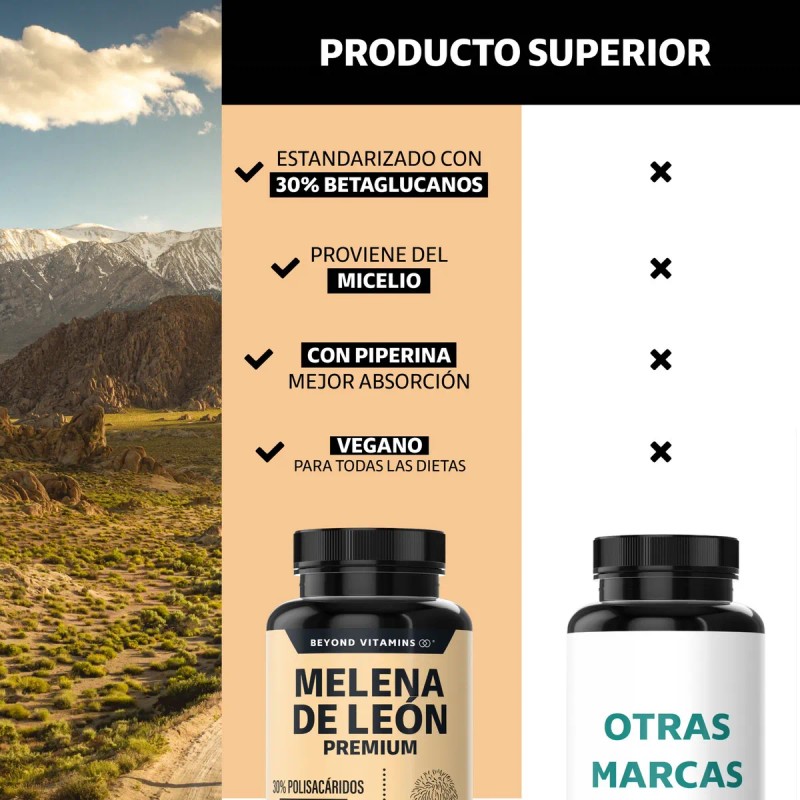 - Presentamos Beyond Vitamins Melena de León Premium, una combinación perfecta de ingredientes premium diseñada para elevar tu rutina diaria a nuevos niveles de vitalidad. Cada porción contiene extracto de Melena de León con 30% de polisacáridos y Piperina al 95% para máxima biodisponibilidad, dos de los tesoros más valiosos de la naturaleza. Melena de León: Un ingrediente fantástico Extraída del micelio y conocida por sus múltiples beneficios, la Melena de León es un producto natural y poderoso. Fórmula Mejorada con Piperina La inclusión de Piperina no es casualidad. Este potente bioenhancer asegura que tu cuerpo absorba y utilice al máximo cada nutriente, proporcionando mayores beneficios en cada cápsula y elevando tu bienestar a nuevas alturas. LOS SUPLEMENTOS BEYOND VITAMINS SON: