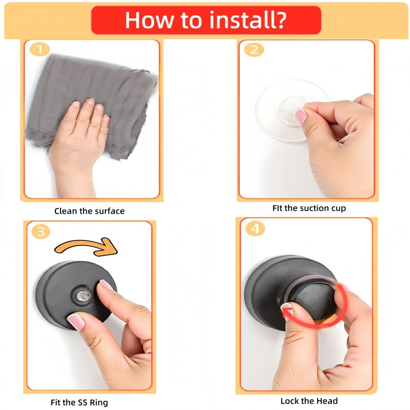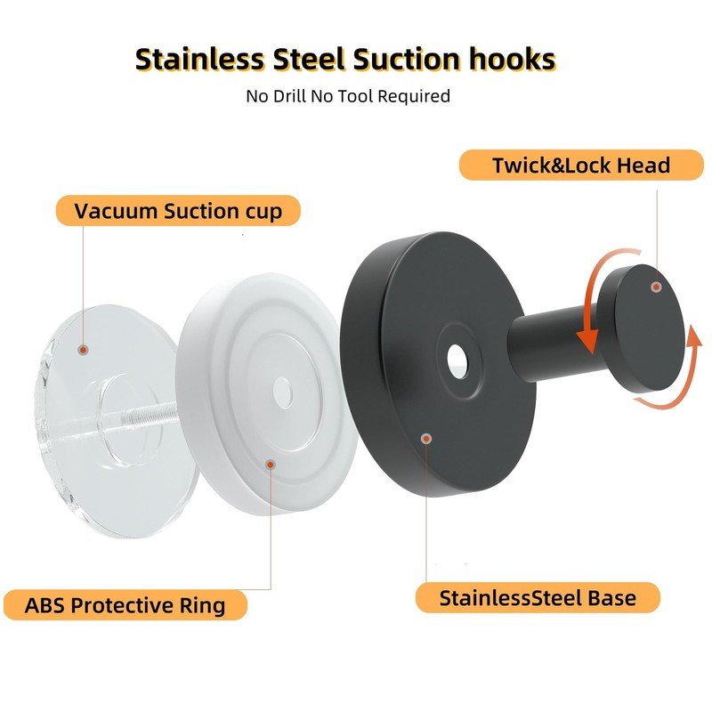 - 【Easy Installation No Tool No Drill】1. clean the smooth surface you want put. 2. Loosen the hook counter-clockwise. 3. Press the base firmly against the surface, then twist clockwise to secure. No drilling, no damage—just instant convenience and a pristine look. The vacuum suction combined with the sticky PVC base ensures the strong adhesive firmly , even in the steamiest conditions!