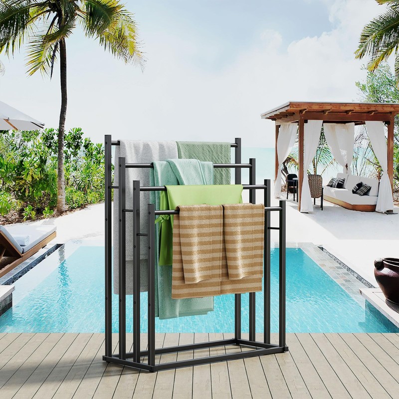 - 【4 Tier Free Standing】4 Towel bars are 27.2 inches, 31.1inches, 35.1 inches, 38.9inches, from low to high, and the oversized bath towel will not touch the floor to keep the towel clean and hygienic. Spacious ventilation helps to quickly dry bath towels, suitable for bathroom, laundry room, bedroom and poolside.