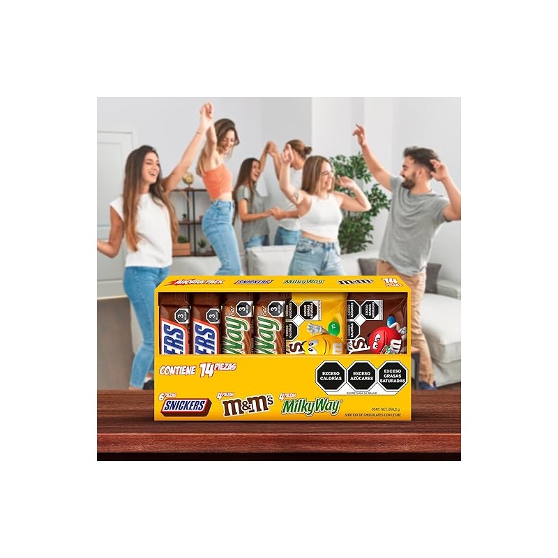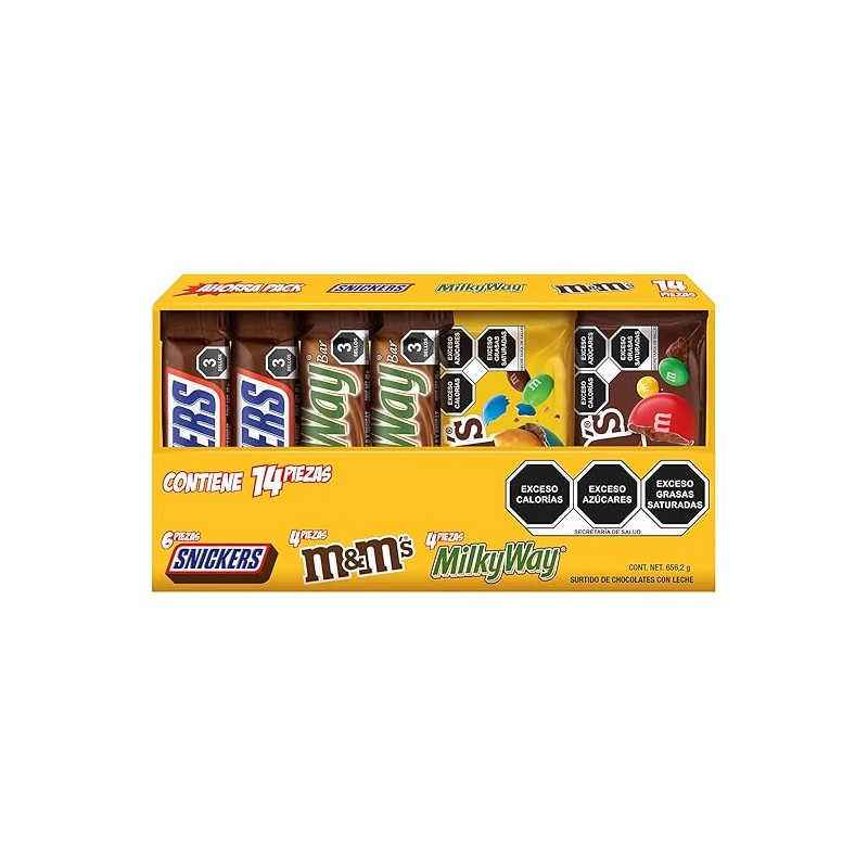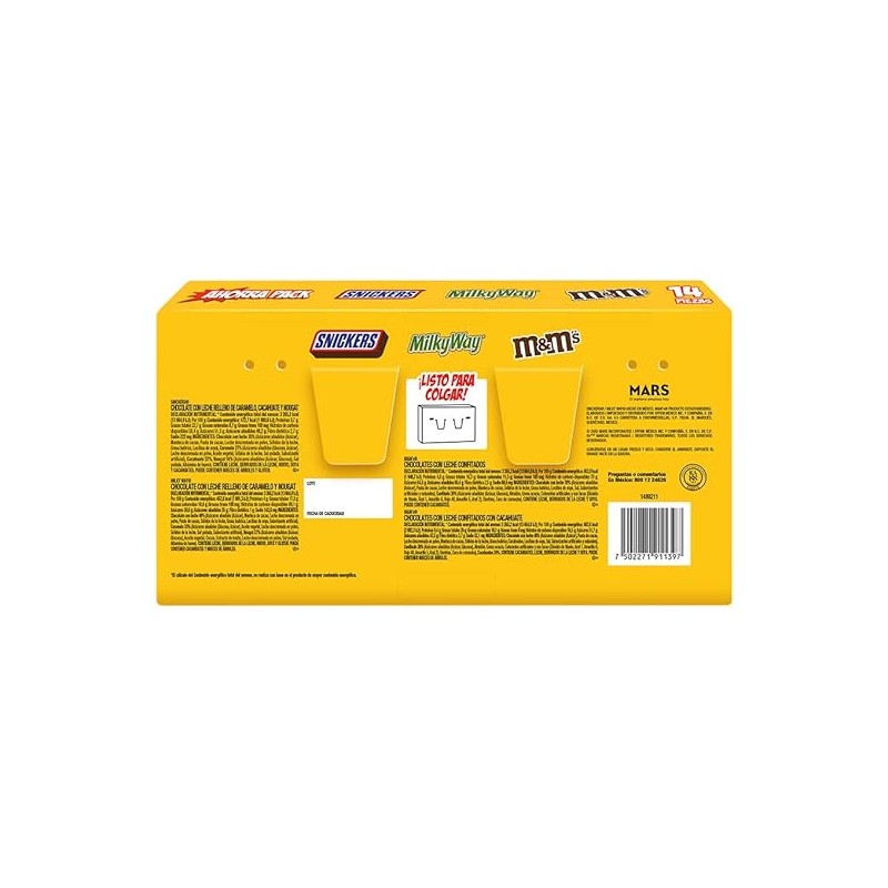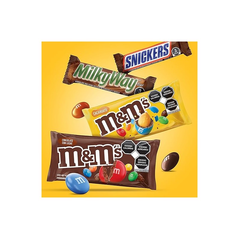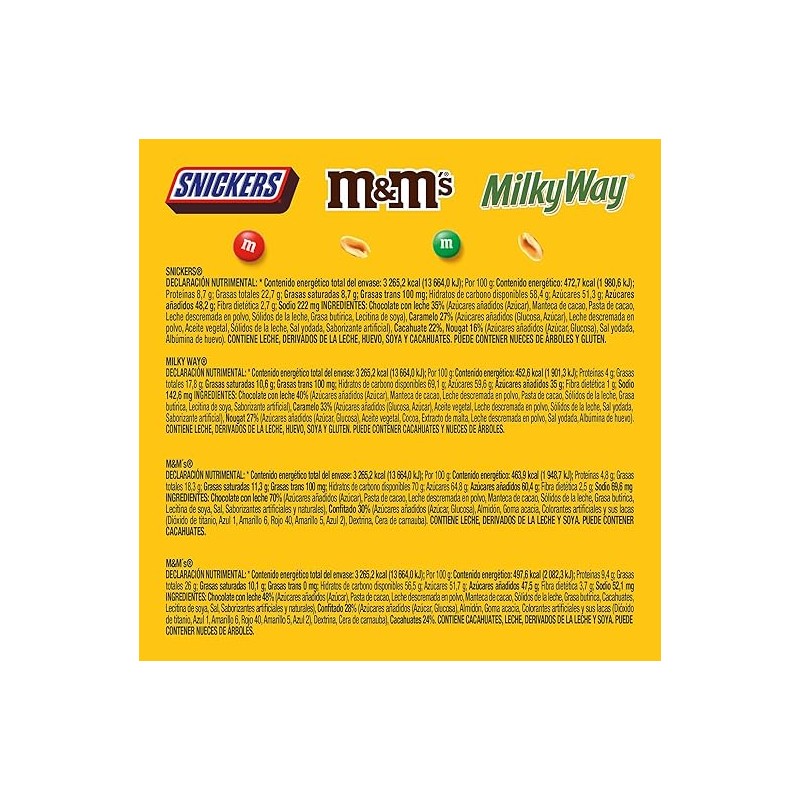 INGREDIENTES PEANUT: CHOCOLATE CON LECHE 48% (AZÚCARES AÑADIDOS (AZÚCAR), PASTA DE CACAO, LECHE DESCREMADA EN POLVO, MANTECA DE CACAO, SÓLIDOS DE LA LECHE, GRASA BUTÍRICA, CACAHUATES, LECITINA DE SOYA, SAL, SABORIZANTES ARTIFICIALES Y NATURALES), CONFITADO 28% (AZÚCARES AÑADIDOS (AZÚCAR, GLUCOSA), ALMIDÓN, GOMA ACACIA, COLORANTES ARTIFICIALES Y SUS LACAS (DIÓXIDO DE TITANIO, AZUL 1, AMARILLO 6, ROJO 40, AMARILLO 5, AZUL 2 ), DEXTRINAS, CERA DE CARNAUBA), CACAHUATES 24%. INGREDIENTES M&MS MILK: CHOCOLATE CON LECHE 70% (AZÚCARES AÑADIDOS (AZÚCAR), PASTA DE CACAO, LECHE DESCREMADA EN POLVO, MANTECA DE CACAO, SÓLIDOS DE LA LECHE, GRASA BUTÍRICA, LECITINA DE SOYA, SAL, SABORIZANTES ARTIFICIALES Y NATURALES), CONFITADO 30% (AZÚCARES AÑADIDOS (AZÚCAR, GLUCOSA), ALMIDÓN, GOMA ACACIA, COLORANTES ARTIFICIALES Y SUS LACAS (DIÓXIDO DE TITANIO, AZUL 1, AMARILLO 6, ROJO 40, AMARILLO 5, AZUL 2), DEXTRINAS, CERA DE CARNAUBA). INGREDIENTES MILKYWAY: CHOCOLATE CON LECHE 40% (AZÚCARES AÑADIDOS (AZÚCAR), MANTECA DE CACAO, LECHE DESCREMADA EN POLVO, PASTA DE CACAO, SÓLIDOS DE LA LECHE, GRASA BUTÍRICA, LECITINA DE SOYA, SABORIZANTE ARTIFICIAL), CARAMELO 33% (AZÚCARES AÑADIDOS (GLUCOSA, AZÚCAR), ACEITE VEGETAL, LECHE DESCREMADA EN POLVO, SÓLIDOS DE LA LECHE, SAL YODADA, SABORIZANTE ARTIFICIAL), NOUGAT 27% (AZÚCARES AÑADIDOS (AZÚCAR, GLUCOSA), ACEITE VEGETAL, COCOA, EXTRACTO DE MALTA, LECHE DESCREMADA EN POLVO, SAL YODADA, ALBÚMINA DE HUEVO). INGREDIENTES SNICKERS: CHOCOLATE CON LECHE 35% (AZÚCARES AÑADIDOS (AZÚCAR), MANTECA DE CACAO, PASTA DE CACAO, LECHE DESCREMADA EN POLVO, SÓLIDOS DE LA LECHE, GRASA BUTÍRICA, LECITINA DE SOYA), CARAMELO 27% (AZÚCARES AÑADIDOS (GLUCOSA, AZÚCAR), LECHE DESCREMADA EN POLVO, ACEITE VEGETAL, SÓLIDOS DE LA LECHE, SAL YODADA, SABORIZANTE ARTIFICIAL), CACAHUATE 22%, NOUGAT 16% (AZÚCARES AÑADIDOS (AZÚCAR, GLUCOSA), SAL YODADA, ALBÚMINA DE HUEVO).