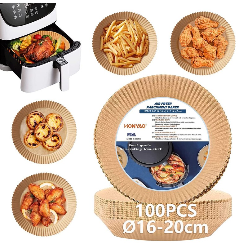 - Keep hot air fryer clean: disposable air fryer baking paper keeps the air fryer as clean as before use and prevents food residue and grease stains from remaining on the hot air fryer, reduces cleaning time. The best accessory for hot air fryers. HONYAO Hot air fryer paper liner has a better design and more folds on the edge, it retains a better shape during cooking, does not curl in the middle of the basket and burn.
