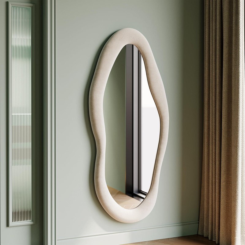 Honyee 55" x 24" Wall Mirror, Flannel Wrapped Wooden Frame Wavy Mirror, Irregular Mirror Hanging for Cloakroom/Bedroom/Living Room, Ivory White