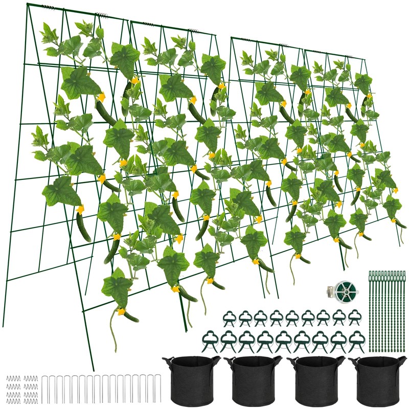 HONYTA Foldable Cucumber Trellis, 46" L x 18" W A-Frame 4 Pack Cucumber Trellis for Raised Bed Garden Vegetable Grow Supports, Steel Trellis with Twist Ties & Plant Bags for Climbing Plants Outdoor
