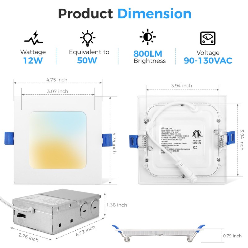 - 💡【5 Color Options】 This canless square recessed light offers five color temperatures—2700K, 3000K, 3500K, 4000K, and 5000K—in one fixture. Flip the switch on the junction box to match the perfect lighting for your mood, task, or room style.