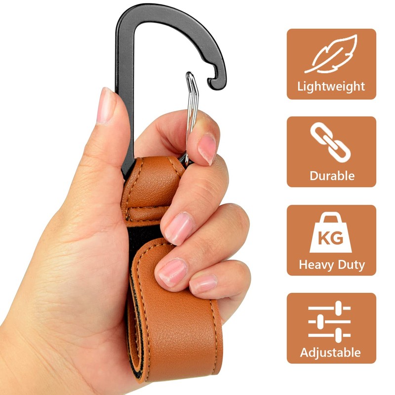 • 【STRONG STABILITY】The product is made of sturdy and durable aluminum alloy Mountaineering buckle, high-quality Velcro and leather, which can effectively grasp the handle surface of the stroller. Each clip can hold up to 5 kg.
