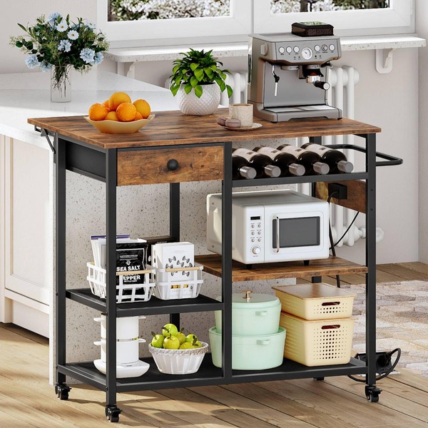 HOOBRO Kitchen Island with Storage, Rolling Kitchen Island Cart with Drop Leaf Countertop & Outlet, 4 Tier Coffee Station and Microwave Stand, Island Table for Home, Rustic Brown BF22UZD01