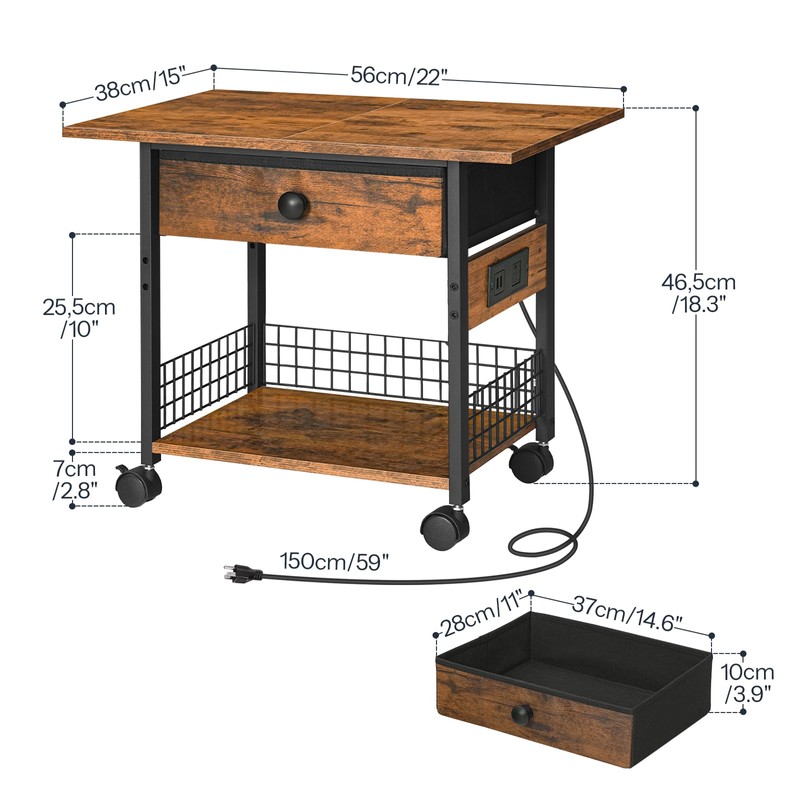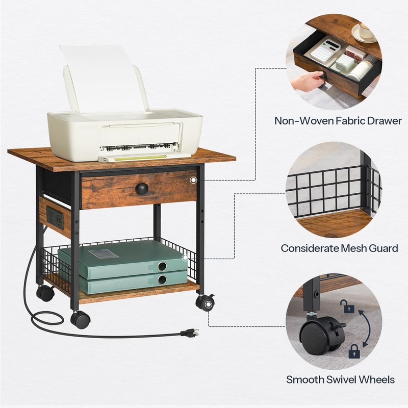 HOOBRO Printer Stand with Charging Station, 2-Tier Printer Cart, Under Desk Printer Table with Power Outlet, Wheeled Printer Table with Fabric Drawer, for Home Office, Rustic Brown and Black BF56UPS01