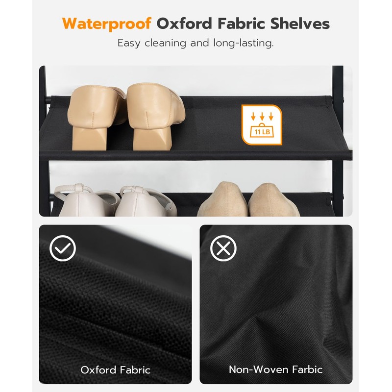 - Sturdy Build: Made of strong metal, premium particleboard and resilient Oxford, the shoe rack is made to endure. Each Oxford shelf holds 11 lb and the top can hold 44 lb. It's outfitted with adjustable feet and an anti-tip kit for unwavering stability