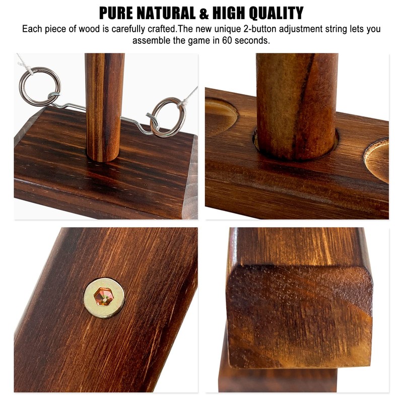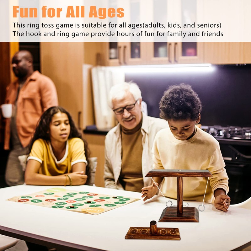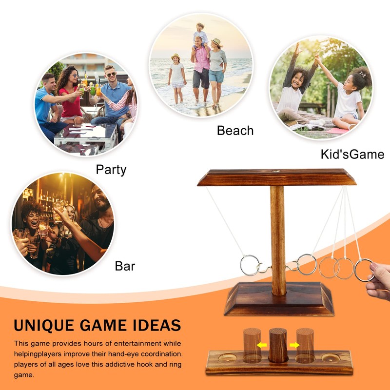 - 👍 Playing instructions: Place the small wooden block in the please of the board, throw the ring and hook it on the hook. Every time you land the hook, move the wooden cup 1 field towards your opponent. The player wins when the wooden cup moves from the end of the ladder.