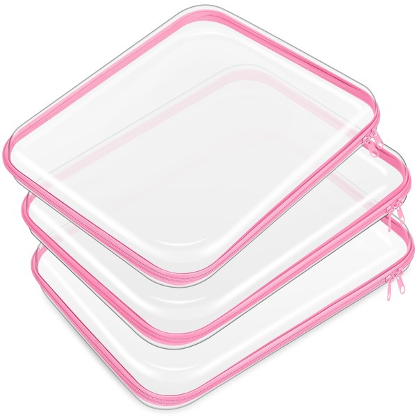 Hoolerry 3 Pcs Clear Hard Zipper Case Plastic Pouch Transparent Hard Case Clear Makeup Bag Portable Travel Organizer Bin for Cosmetics, Building Blocks, Puzzles(Pink,L)