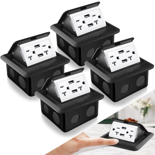 Hoolerry 4 Pack Pop up Floor Outlet Kit Waterproof Electrical Outlet Cover Box with 4.8A USB Charger 20Amp Weatherproof Floor Outlet Tamper Resistant Outlet Receptacle for Countertop Home (Black)