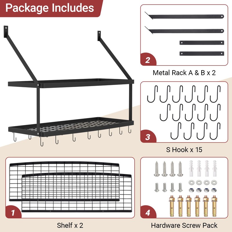 - Sturdy Grid Shelf - Our 2-tier hanging pot rack is crafted with high-strength carbon steel, thickened and upgraded design to withstand heavy pots and pans without warping, with powder-coated finish outside effectively preventing rust and is easy to clean.