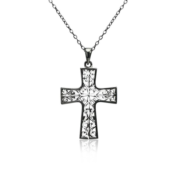 Hoops & Loops Black Flashed Sterling Silver Two-Tone Diamond-cut Filigree Cross Pendant Necklace