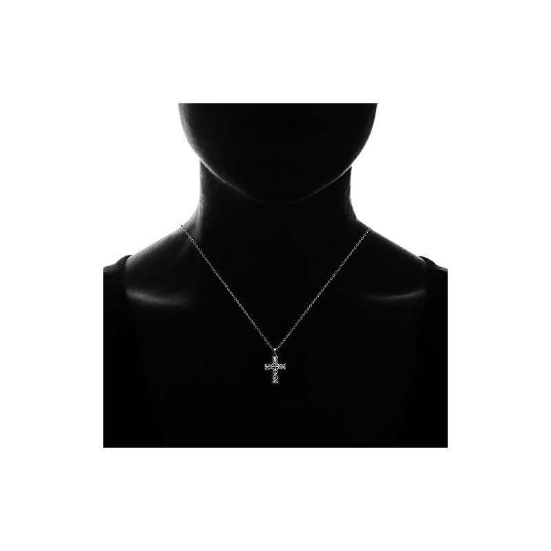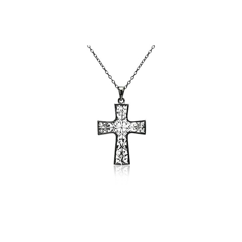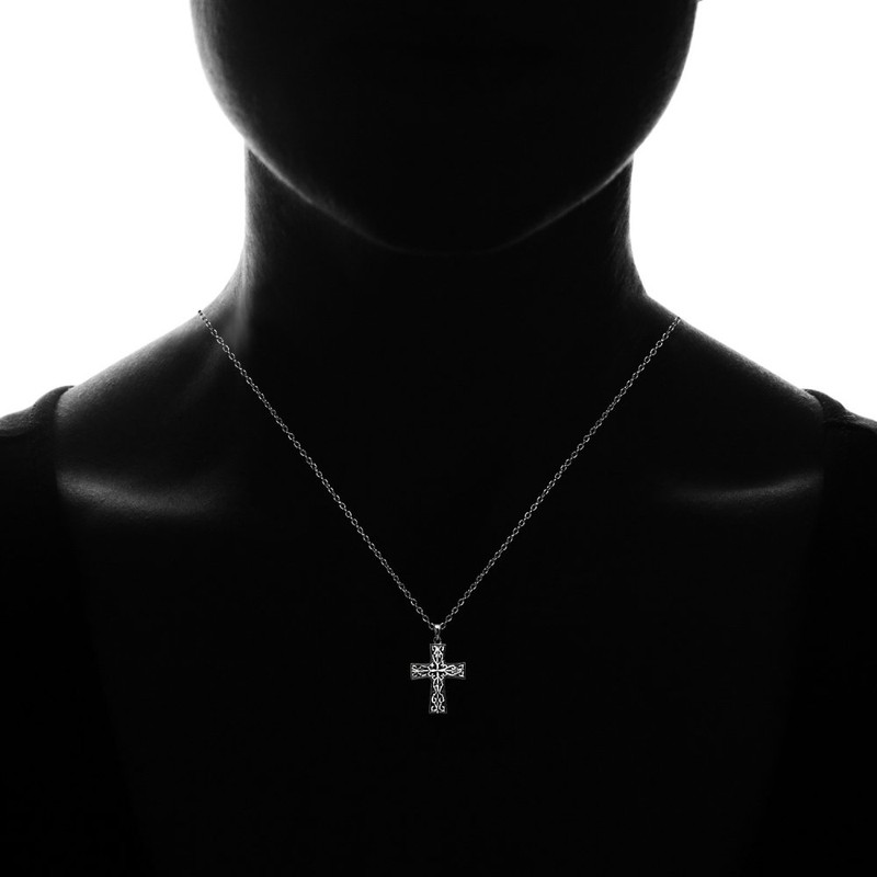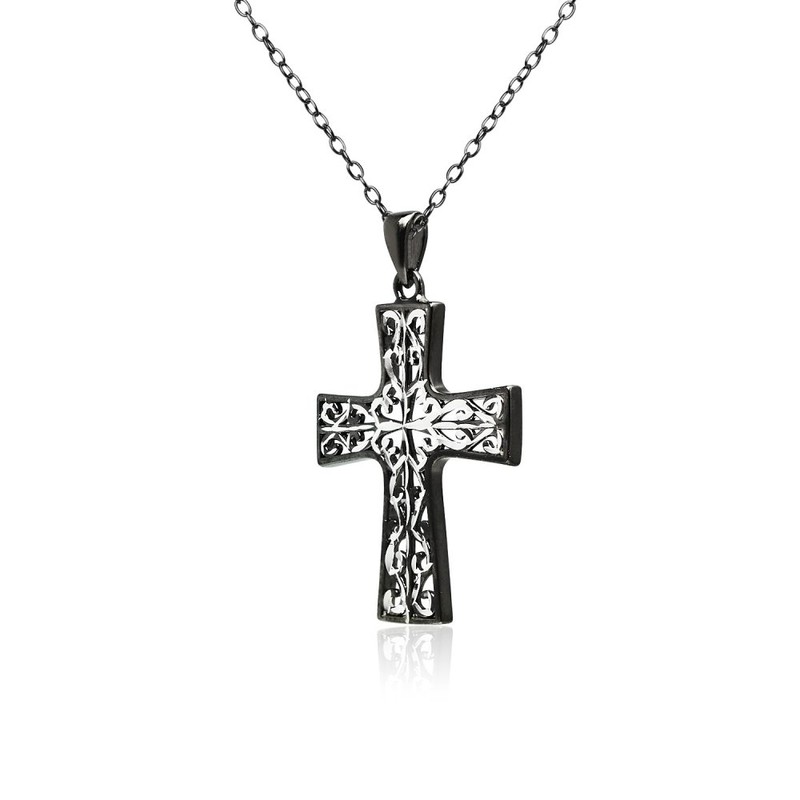 - This attractive necklace is the perfect addition to any jewelry and accessories collection. This necklace showcases a high polished diamond-cut celtic filigree cross, made of two-tone black flashed sterling silver. The pendant hangs from a 18 inch rolo chain and secures with a spring-ring clasp. This necklace can be purchased as necklaces for women and necklaces for teen girls.