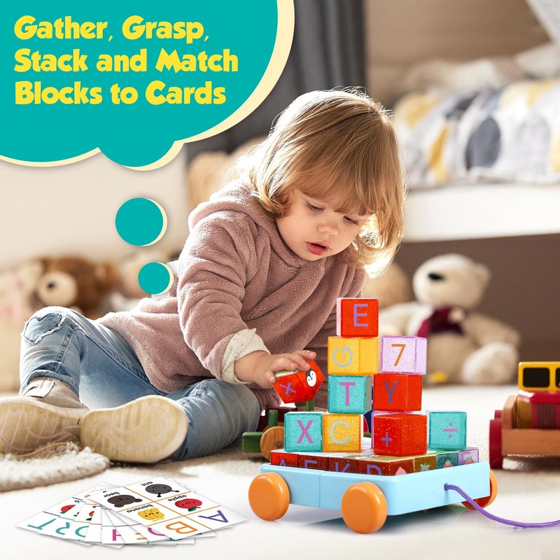 HOPANDOS 56-Piece Acrylic Building Blocks for Toddlers 1-3, Montessori Alphabet & Number Set with 2m Pull Car & 13 Flashcards, Consistent A-Z Learning (A=Apple/Ant), CPSC Certified Baby Kids Toys