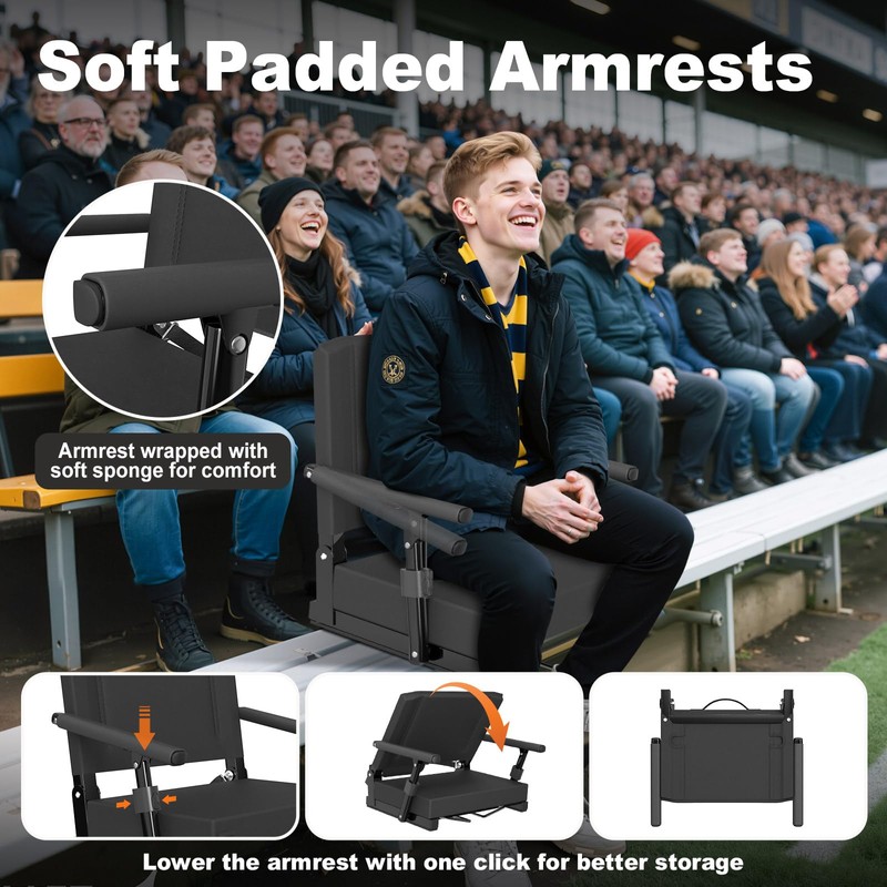 - 【4-Hour Games, Zero Back Pain】Say goodbye to hard bleachers! Our stadium seats with back support and armrests feature extra-thick foam cushioning and an body-hugging design to keep you comfortable through long games, concerts, or sidelines waiting. These bleacher chairs with back and cushion are perfect for any outdoor occasion—no more sore backs!