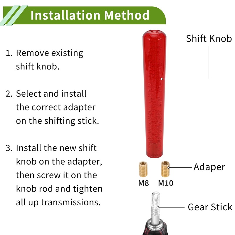 - Easy To Install: 1. Remove the existing gear shift head; 2. Select and install the correct adapter (M8/M10); 3. Install the new gear knob on the adapter; 4. Insert the shift knob rod directly and tighten it to complete the installation.