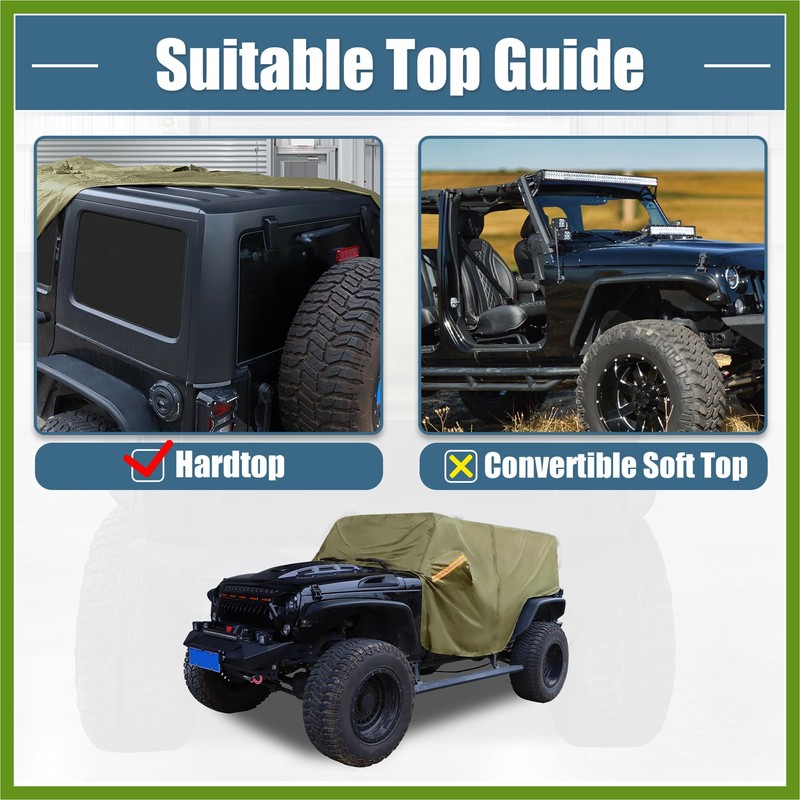 - Durable: Adaptable: [Fitment] Cover Size: 290x165x140cm /114"x65"x55"(L*W*H). SUV Car Cover for Jeep Wrangler JK Hardtop 4 door 2007 2008 2009 2010 2011 2012 2013 2014 2015 2016 2017, for Jeep WranglerJL Hardtop 4 door 2018 2019 2020 2021