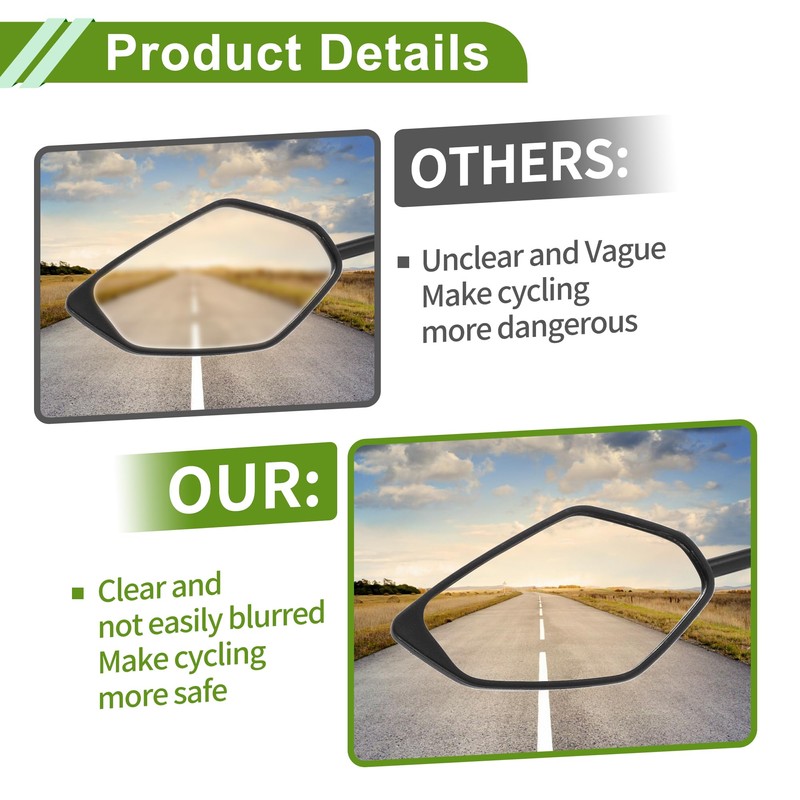 • Easy To Install:This product can be easily installed above or below the handlebar. Allows the mirror to rotate 360 degrees and can be freely adjusted up, down, or side to side for good optimal viewing angle.