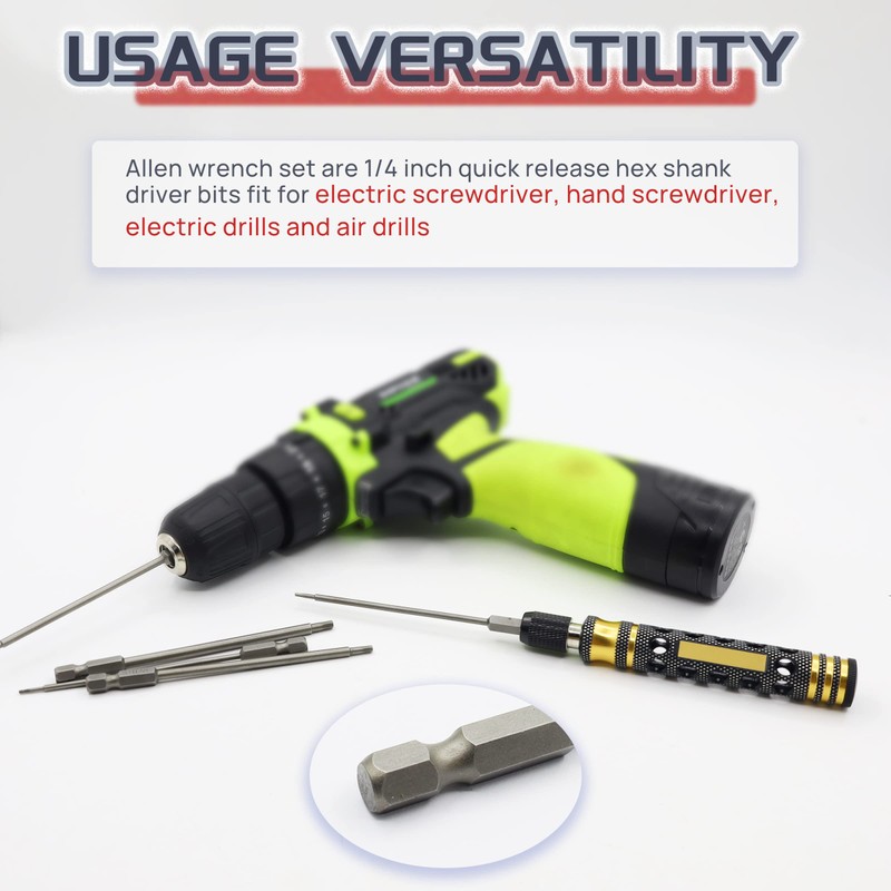 - 【Usage Versatility】Allen wrench set are 1/4 inch quick release hex shank driver bits fit for electric screwdriver, hand screwdriver, electric drills and air drills