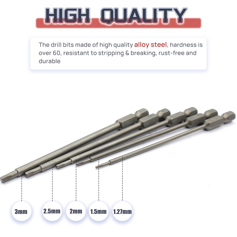 HOPLEX 5PCS RC Hex Bit 1.27mm 1.5mm 2.0mm 2.5mm 3.0mm Hex Head Allen Wrench Drill Bit Set for Screwdrivers Electric Screwgun/Power Drill