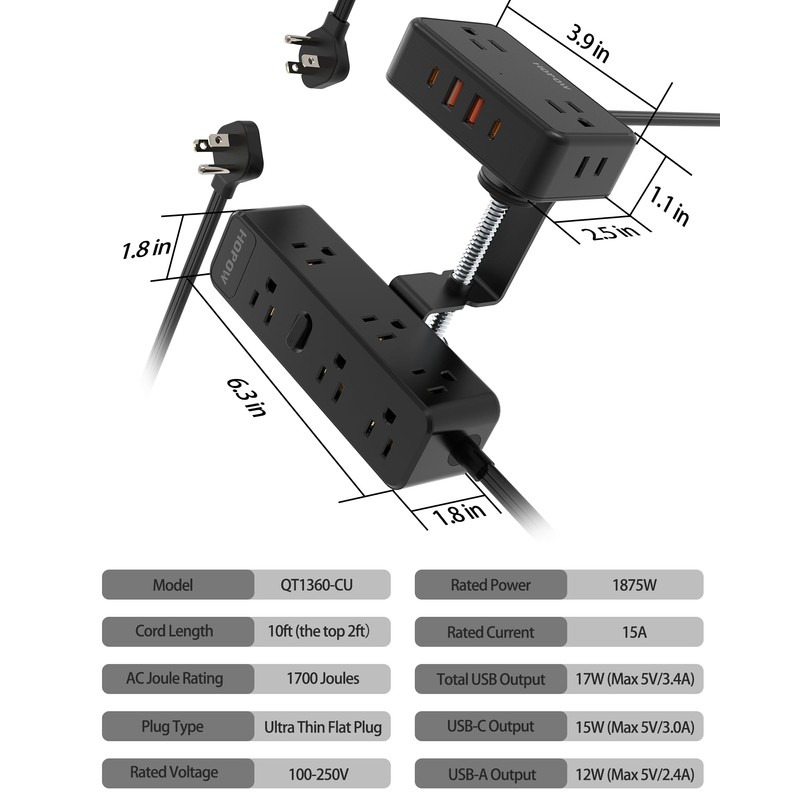 - [1700 Joule Surge Protector & 15A overload protection switch]: The desk clamp power strip has a 1700-Joule energy rating providing a reliable surge protector that protects your equipment safely during thunderstorms. With a 15A overload protection switch, don't worry if you forget to unplug it, it automatically disconnects when the power exceeds 1875W to keep your device safe.