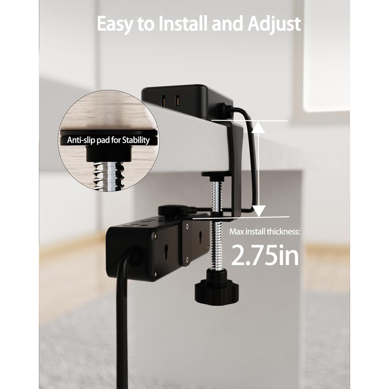 - [Freely adjustable to table thickness & Stable anti-slip mat]: This desktop clamp power strip can be freely adjusted according to the thickness of the table, the maximum can clip 7cm/2.75in thickness table. What's more, nuts with non-slip pads for extra stability.