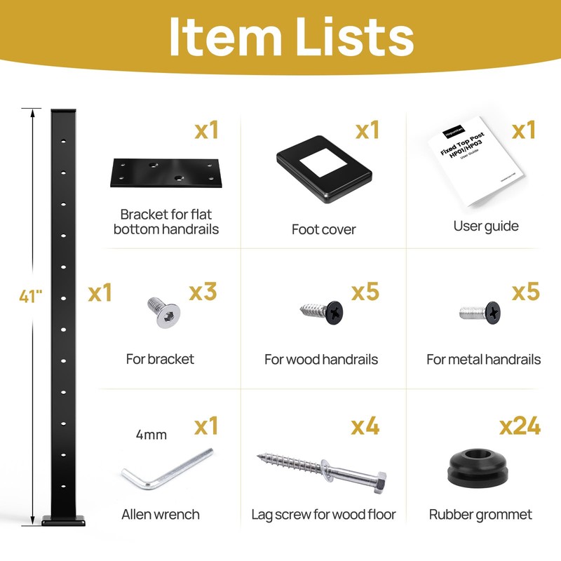 - Package Included: The package includes 1 Pack 42"x2"x2" black square post with flat fixed top, 1 allen wrench, 1 user guide and other necessary installation screws and accessories. You can match with our other products to construct your cable railing system: HP03 42" corner post and HP02 42" stair post