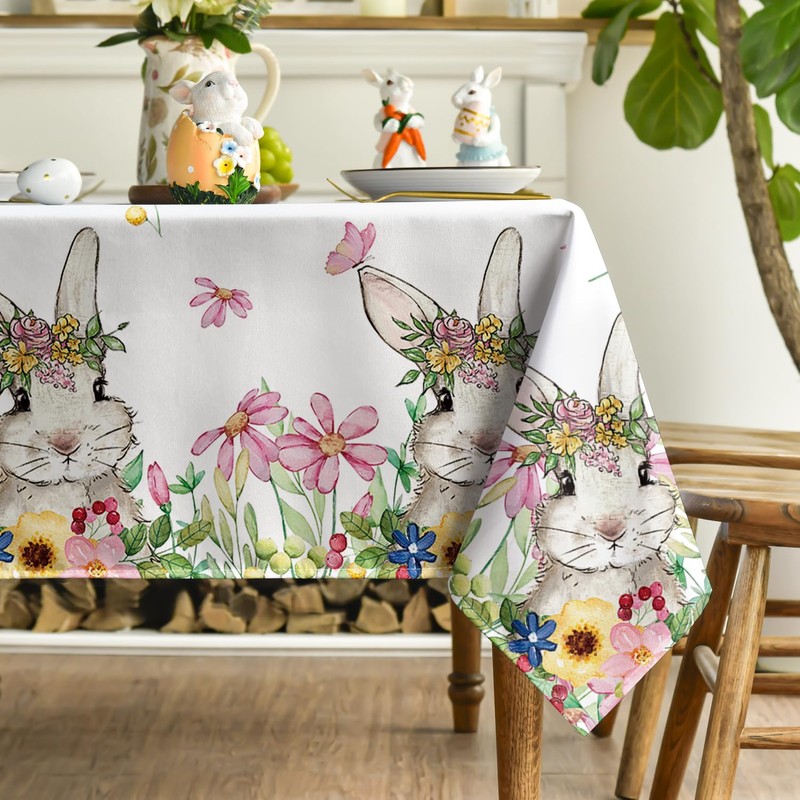 Horaldaily Easter Tablecloth 60×84 Inch Rectangular, Spring Flower Bunny Washable Table Cover for Party Picnic Dinner Decor