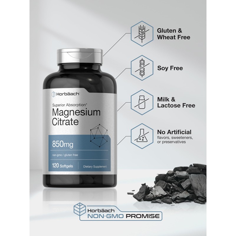 Horbäach Magnesium Citrate | 850mg | 120 Softgels | Superior Absorption | Non-GMO and Gluten Free Formula