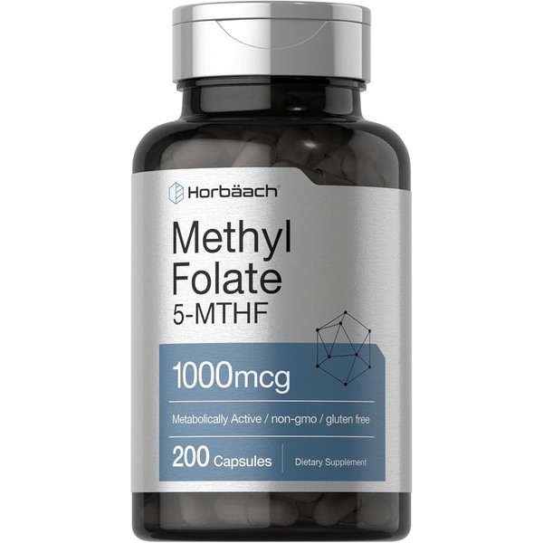 Horbäach Methyl Folate Supplement | 1000 mcg | 200 Capsules | 5-MTHF | Folic Acid | Non-GMO, Gluten Free Methylfolate